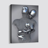 This striking masterpiece features two mesmerizing humanoid figures locked in a passionate embrace, symbolizing both trust and fragility. Crafted from chromatic steel and ethereal mesh, it creates a breathtaking interplay of light and form.