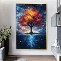 A radiant tree, its crimson leaves glowing like embers, stands beneath a sky dusted with stardust. The contrast of fiery hues against the midnight canvas creates an atmosphere of mystery and wonder—a perfect piece for those who long for enchantment in their space.
