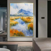 A serene landscape alive with color, this piece captures a golden meadow stretching toward a distant mountain. The calm waters of a winding stream reflect the sky above, doubling the beauty of the scene with a glasslike mirror effect. Vibrant orange grasses and delicate purple blooms add warmth and contrast, bringing the painting to life.