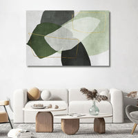 A graceful dance between form and nature, weaves soft organic shapes with precise golden outlines. Layers of deep green, muted gray, and gentle sage flow together, evoking leaves caught in an abstract embrace. The interplay of transparency and line work creates a serene balance — where the structure of geometry meets the fluidity of the natural world.