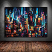 This artwork captures the allure of an illuminated skyline, with skyscrapers awash in bold neon hues and reflections that dance in the urban night. It brings to life the electric energy of a bustling cityscape, where every window and light feels like a story waiting to unfold.