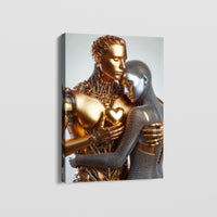 A golden being cradles a silver companion, their metallic forms entwined in a gesture of eternal devotion. Gleaming textures and intricate details capture the tenderness shared between these futuristic figures, exuding a powerful sense of connection.