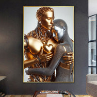 A golden being cradles a silver companion, their metallic forms entwined in a gesture of eternal devotion. Gleaming textures and intricate details capture the tenderness shared between these futuristic figures, exuding a powerful sense of connection.