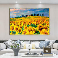 A field of sunflowers stretches across the canvas, their bright yellow faces reaching toward a soft, sunlit sky. A distant house and a few trees add to the peaceful rural setting, inviting you to bask in nature’s warm embrace.