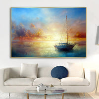 This stunning piece captures the gentle allure of a sailboat journeying through a sun-kissed ocean, bathed in warm, golden hues. It whispers of new beginnings, endless horizons, and the promise of calm waters ahead. A tranquil voyage that stirs the soul, beckoning you to chase dreams across the endless expanse.