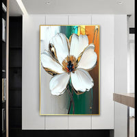 The soft white petals unfold with hints of golden accents, set against a bold, modern background of jade green, burnt orange, and muted gray. Each brushstroke exudes depth, creating a refined balance between nature and contemporary art.