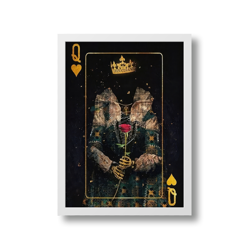 Welcome to the eerie world of "Queen of Hearts," where intrigue and elegance combine in a captivating portrayal. This artwork depicts a faceless queen from a deck of cards, dressed in a captivating black and gold theme. A resplendent golden crown and a royal gown.. Her hands, transformed into golden skeletons, delicately hold a vibrant red rose, representing passion and mystery.