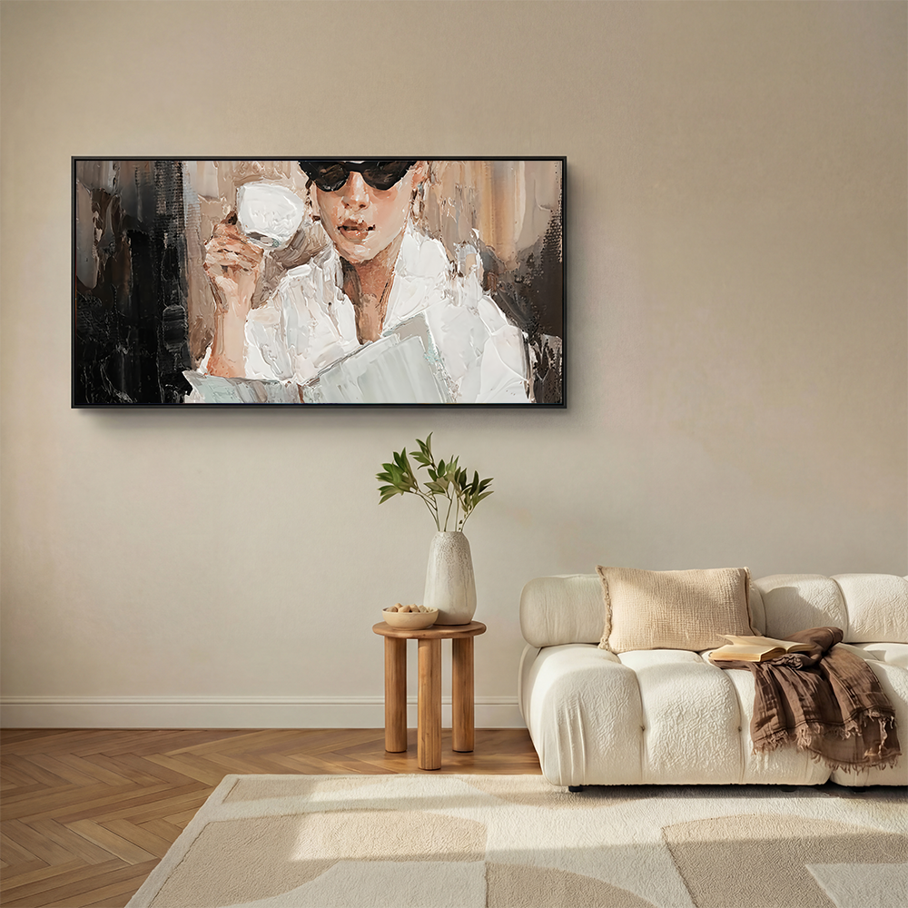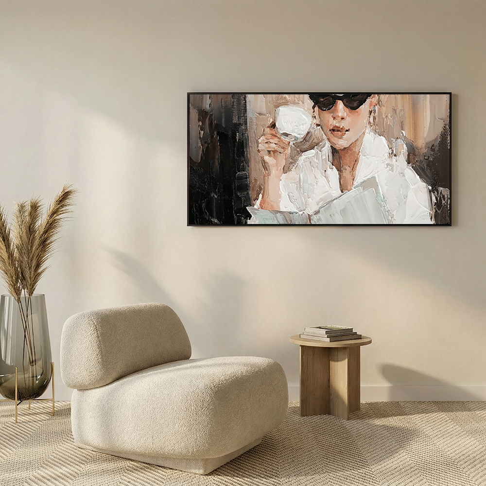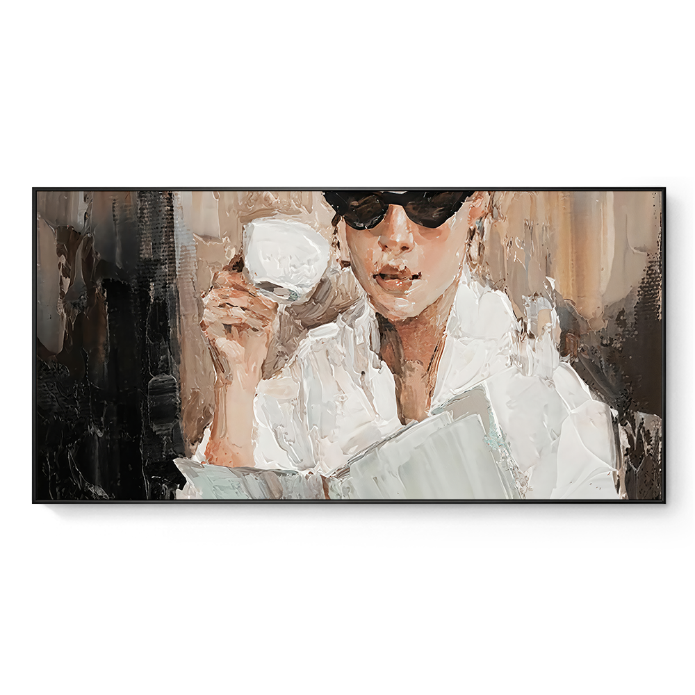 A poised woman, draped in white, sips from a delicate cup while holding a folded newspaper. Bold, textured brushstrokes blend warm neutrals and soft pastels, creating a refined yet modern aesthetic.