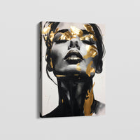 Add a touch of bewitchment by adding "Golden Lux" to your space. This beautiful charcoal portrait of a woman captures a moment of deep feeling, her eyes closed and lips sensually pouting. Gold accents highlight her face, enhancing the emotion of longing.