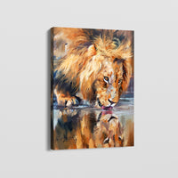 "Lion Heart" portrays the king of the jungle drinking at the riverbank, capturing a lively scene with his reflection. Perfect for stairways, the living room, or a boy's room, this artwork adds a touch of wild energy and majesty to your space. Crafted to resonate and evoke feelings daily, this hand-stretched piece instantly creates a spirited ambiance, making a significant impact on your daily life.