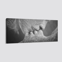 This evocative painting features delicate white nerves forming the image of lovers locked in a tender kiss against a serene gray background. The artist’s masterful use of shapes and negative space beautifully conveys both solitude and connection.