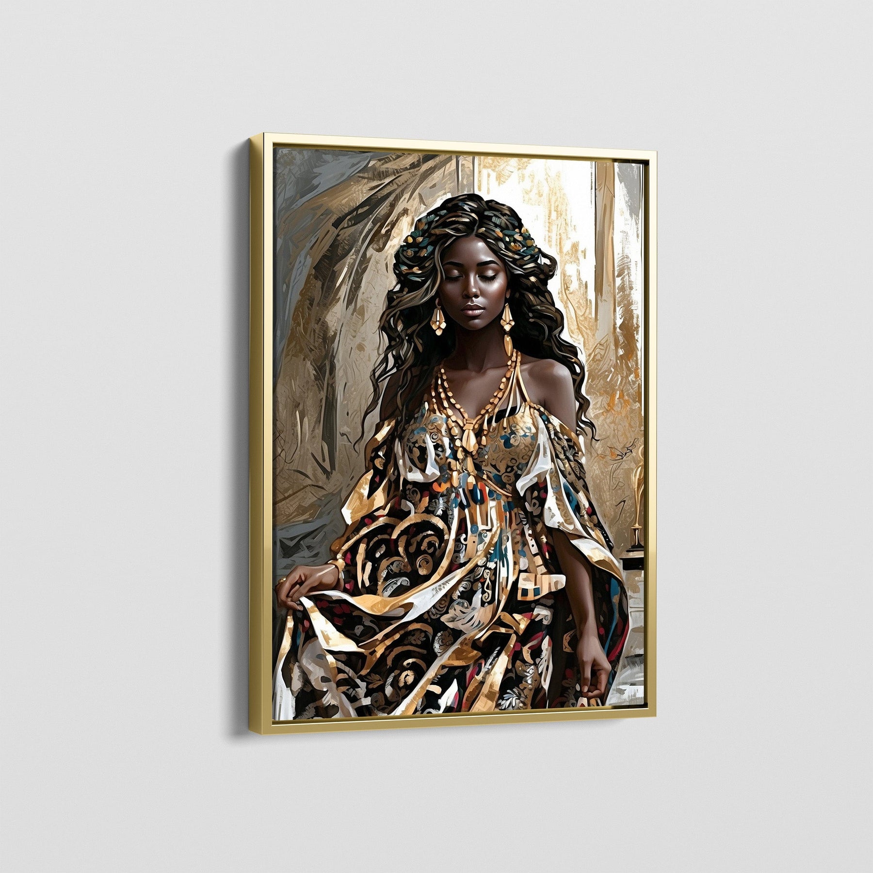 Experience the opulent elegance of "Gold and Beads," a captivating artwork featuring a black woman adorned in a couture dress and accessories embellished with luxurious gold and beads. With every detail meticulously crafted, this piece exudes sophistication and glamour. Bring home this exquisite masterpiece today and adorn your space with the radiant beauty of "Gold and Beads." Purchase this captivating artwork now and enrich your surroundings with its undeniable allure and timeless charm.