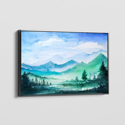 Get ready to drift into a haven of peace with "Calm Nature." This watercolor painting captures a peaceful landscape where green trees and grasses meet teal mountains under a tranquil blue sky. Feel the soothing breeze and the relaxation of gazing out from a forest mountain cabin window. The calm scene invites you to unwind and breathe deeply.