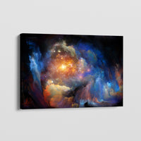 This stunning piece reveals a vast, celestial landscape, where vibrant clouds of color swirl around a brilliant, glowing core. Flecks of light and stardust dot the scene, as if you're gazing into the heart of the universe itself. It invites you to lose yourself in its endless mysteries, stirring a sense of wonder and awe.