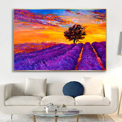 Savor the enchantment of twilight with “Lavenders and Sunset.” This artwork captures the magical moment when lavender fields bask in the glow of a setting sun. Let the vibrant hues of this painting transform your space. The lone tree and vivid sunset bring an ethereal charm that evokes peace and tranquility.