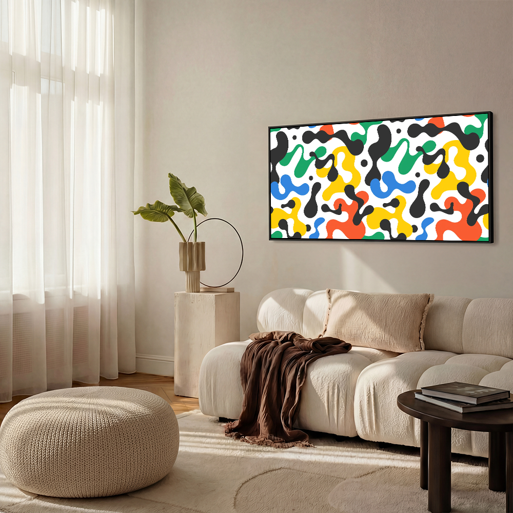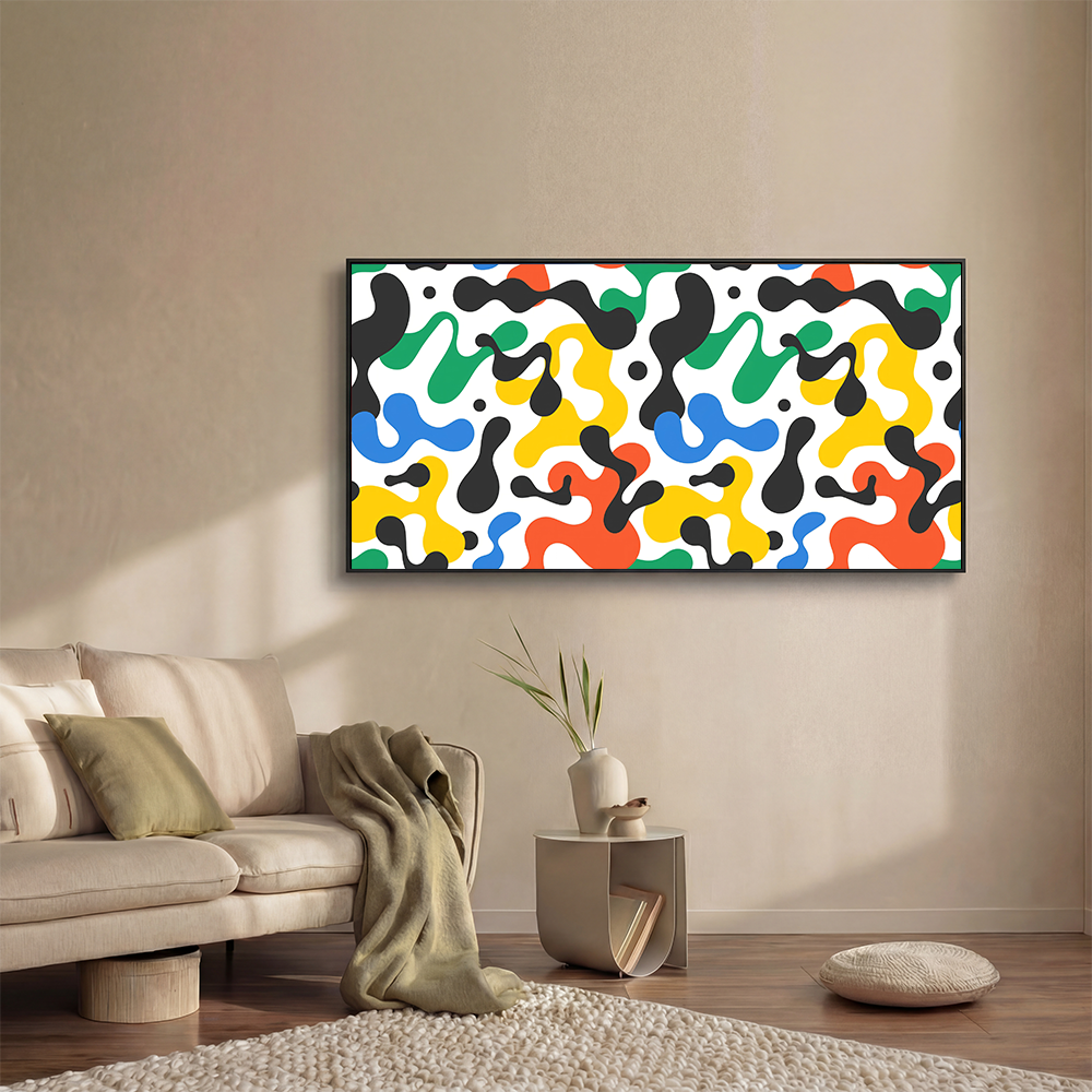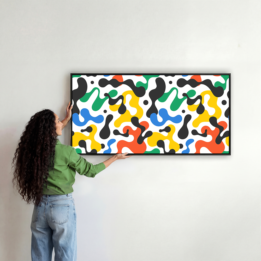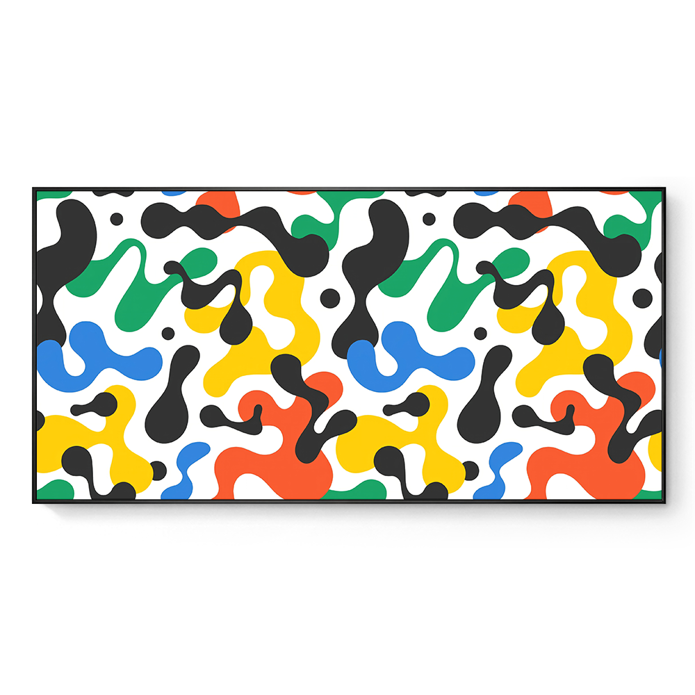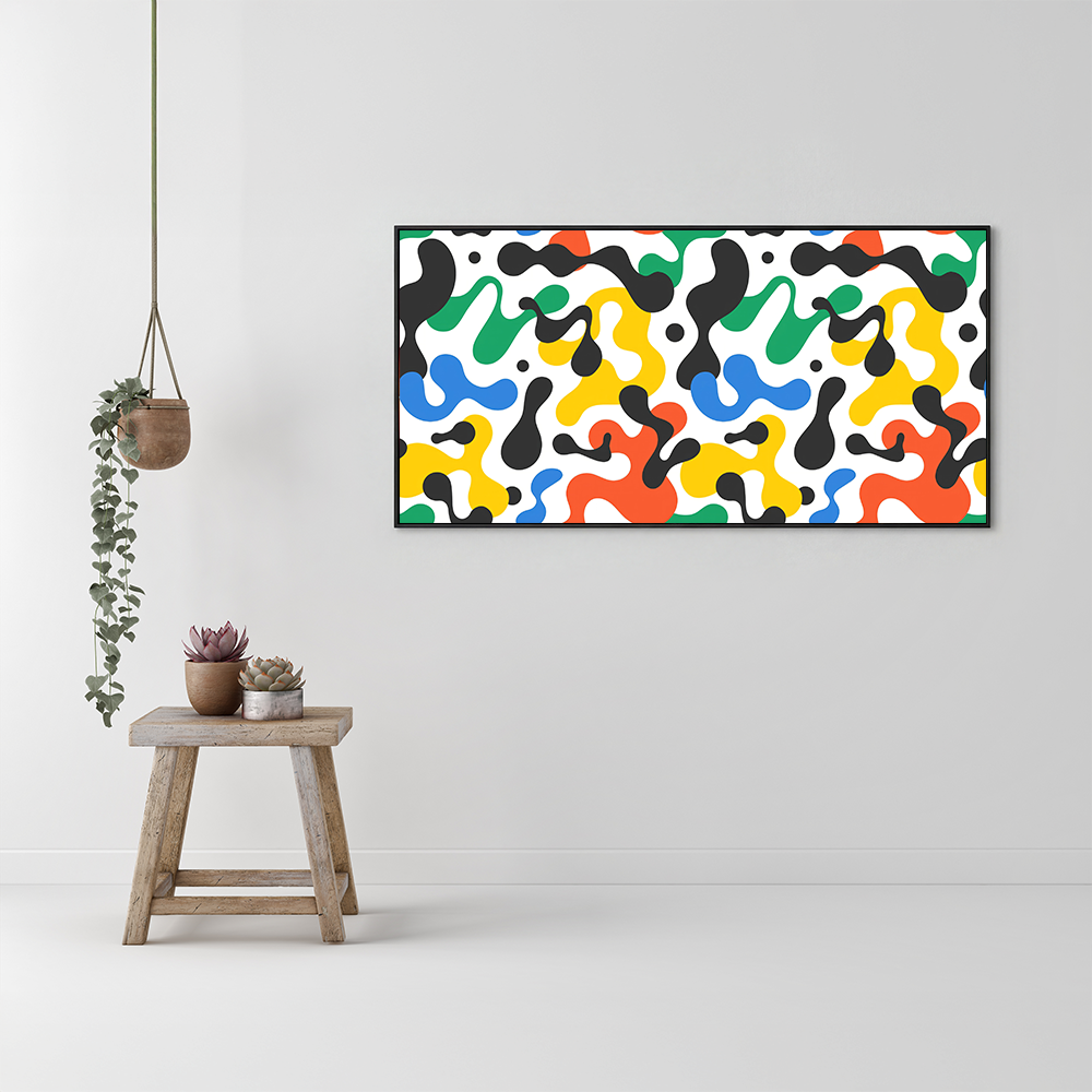 Bold splashes of red, yellow, green, blue, and black twist across a crisp white canvas, creating a symphony of abstract movement. The free-flowing shapes exude vitality, bringing a lively dynamism to any space.