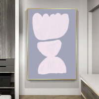 This artwork radiates sophistication, perfect for modern interiors seeking understated charm. Soft, pale shapes resembling petals and curves are delicately layered on a calming lavender-gray canvas, evoking quiet elegance. Each form murmurs of harmony, as though caught in a still moment of reflection.