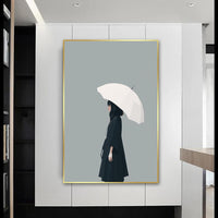 A lone figure, cloaked in deep hues, holds a pristine white umbrella that stands out against the soft, minimalist backdrop. The contrast of dark and light invites a sense of resilience and grace, capturing a moment of introspection.