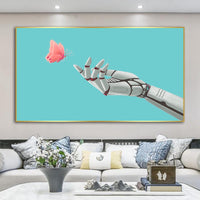 A sleek robotic hand extends gently toward a fluttering pink butterfly, set against a tranquil aqua backdrop. The meeting of metal and delicate wings evokes a story of harmony between the artificial and the organic.