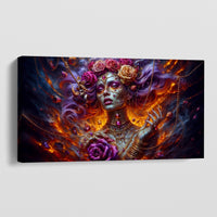 A divine figure emerges in a blaze of passion and opulence, adorned with chains of gold, crowned in roses, and aglow with molten intensity. Violet hair flows like flame, while rubies and embers swirl in a celestial storm around her. Her expression is serene yet commanding—an eternal muse suspended between fire and fantasy, beauty and power.