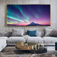 This piece evokes wonder and serenity, perfect for spaces that celebrate the awe of nature. Streaks of emerald and violet blend seamlessly with a twilight sky, reflecting nature’s unbridled splendor. The rich contrast of glowing hues against the darkened horizon creates an ethereal spectacle.