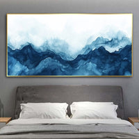 This painting unfolds like waves painted in the language of silence. Shades of indigo and sky blend seamlessly, forming abstract mountains that rise and dissolve into mist. The watercolor strokes ripple with depth, evoking both the power of oceans and the stillness of distant peaks. It feels like standing between earth and sky, where nature speaks in hues of blue.