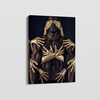 Step into a world of visual allure with "Captured Passion"! An art piece that transcends conventional boundaries. This captivating masterpiece features a black man. He's adorned with intricate golden hands. Gracefully covering his face, chest, shoulders, arms, and abs.