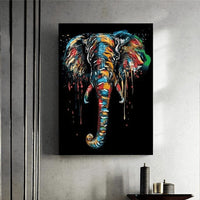 Introducing "Elephant Kunye," a mesmerizing art painting of the majestic elephant. This stunning masterpiece portrays the head of an elephant. Beautifully adorned with an explosion of vibrant colors. Bring life against a deep black background.