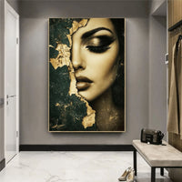 The artwork features a striking female portrait, with half her face subtly revealed through weathered golden textures and deep, dark tones. The interplay of metallic gold and muted green evokes both elegance and intrigue, making it impossible to look away.
