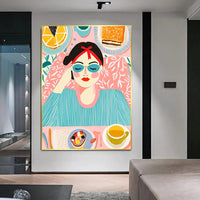 The vibrant, playful scene of a woman lounging with sunglasses, surrounded by brunch delights, invites you to pause and savor life's indulgences. The bold pastel hues of her surroundings contrast beautifully against her serene expression, creating a mood of carefree indulgence. This artwork embodies the essence of slow mornings and treasured moments.