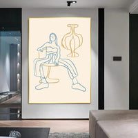 The seated figure's confident posture and striped pants complement the graceful contours of a golden vase. Delicate blue and ochre lines contrast against a soft beige canvas, creating a refined balance of strength and elegance.