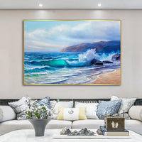 Waves crash with vivid turquoise energy against golden sands, while distant hills glow under a soft horizon. The delicate brushstrokes bring the ocean’s motion to life, capturing its untamed beauty.