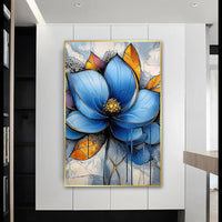 This eye-catching artwork presents a striking blue flower, surrounded by golden-orange petals, set against a textured abstract backdrop. Every line and hue brings a fresh twist to floral beauty, fusing nature with modern flair.