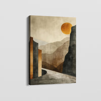 Earthy tones and geometric abstraction meet in a serene landscape where layered mountains resemble soft fabric or aged stone. A winding path draws the eye toward a bold golden sun, casting warmth over the muted scenery and evoking a sense of stillness.