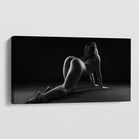 Be kindled by the eroticism of "Seductive Prowl." This provocative artwork features a nude woman, her curves accentuated as she sensually crawls on her back, her enticing form on full display. With her seductive gaze and exposed buttocks, she beckons you into a world of passion and desire.
