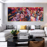 Behold the upbeat mood of "Soulful Jazz." This artwork transports you to a dynamic jazz world filled with vivid characters and lively scenes. With its vibrant colors and exuberant rhythms, the painting captures the essence of jazz music. Feel the music and emotion flow through this captivating piece.