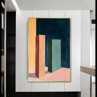 Bold geometric pillars in muted earthy tones rise against a deep blue backdrop, grounded by soft pastel shades of pink and yellow. The deliberate use of perspective and color invites a sense of quiet strength and balance.