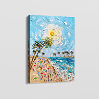 Revel in the joy of summer with "Summer Sun." This vibrant artwork captures the essence of sunlit days on the beach, where laughter and warmth fill the air. Palm trees sway and beachgoers bask under a radiant sun, celebrating the season’s carefree spirit.