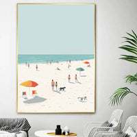 This artwork captures the essence of a perfect beach day, where white sand meets a turquoise sea, and the sky stretches endlessly above. It evokes a feeling of freedom, play, and peace, where families and pets bask in the simple joys of sun, surf, and gentle breezes. Ideal for those who crave the calm and charm of coastal life, this piece will bring a refreshing touch of summer to your space.