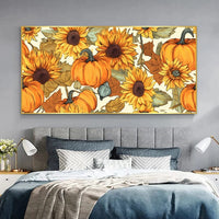 This artwork radiates the warmth of a golden harvest, blending the joy of blooming sunflowers with the rustic charm of pumpkins. It's a perfect tribute to the season of gratitude, filling your space with a sense of abundance and comfort. The cheerful energy invites cozy moments, making it ideal for creating an inviting atmosphere in any room.