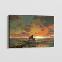 This masterpiece showcases a grand piano perched on a serene shoreline, framed by the glowing hues of a sunset—golden yellows, soft corals, and deep twilight blues blending into a harmonious canvas. The delicate ripples in the water mirror the sky’s warmth, while the piano seems to hum a silent melody of the sea.