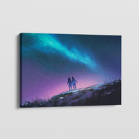 Two silhouetted figures stand side by side, gazing at a dazzling galaxy of stars and a luminous, ethereal blue streak across the heavens. The serene foreground blends into rich hues of purple and pink, creating an enchanting atmosphere of wonder and infinity.