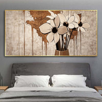 Bold white petals contrast against a raw, sepia-toned canvas, as dripping accents evoke a sense of organic spontaneity. The balance of structure and softness creates a timeless visual harmony.