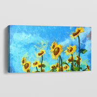 Get ready to bask in shining brilliance with "Vivid Sunflowers." This enchanting painting captures sunflowers in full bloom under a radiant blue sky, embodying the essence of summer and sunlight. Each sunflower stands tall and proud, their golden petals glowing with warmth and vitality.