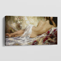 "Wandering Queen" is a sensuous masterpiece capturing the allure of a woman in her boudoir, draped only in silk blankets. Ideal for your master's bedroom, this intimate portrayal adds a touch of sultry elegance to your personal space.