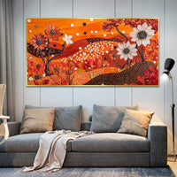 This artwork radiates warmth, capturing the rich tones and playful energy of fall. Stylized flowers with intricate dot patterns dance against a vibrant landscape of oranges, reds, and whites, inviting you into a dreamlike autumn scene.