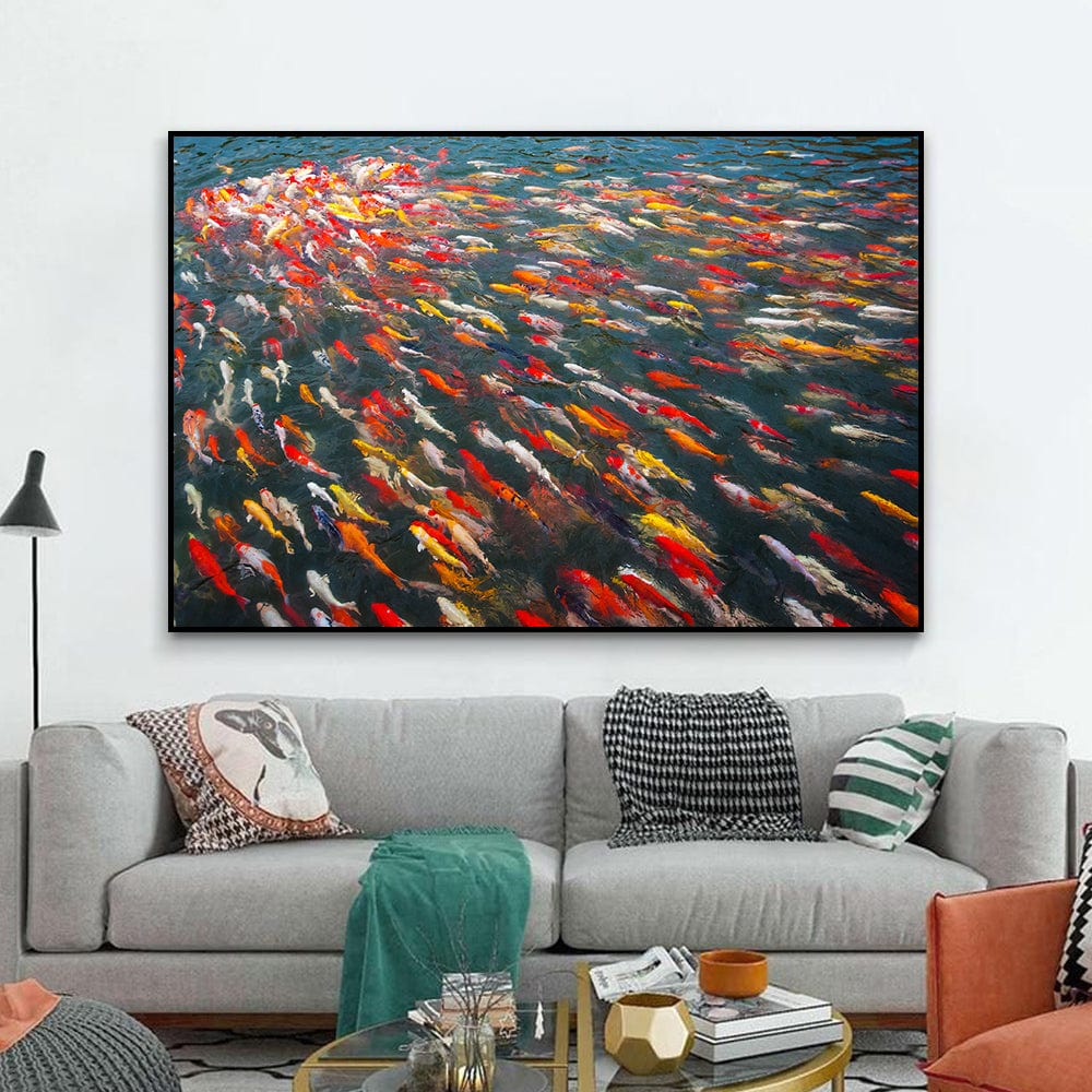 This serene painting captures the beauty of a pond teeming with vibrant koi in myriad colors, all gracefully moving in harmony. Experience the elegance of nature's dance, captured on canvas.