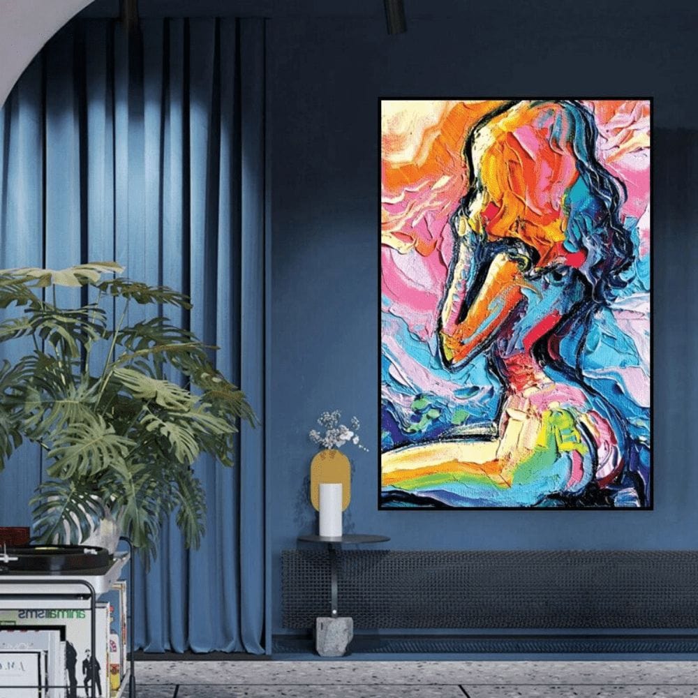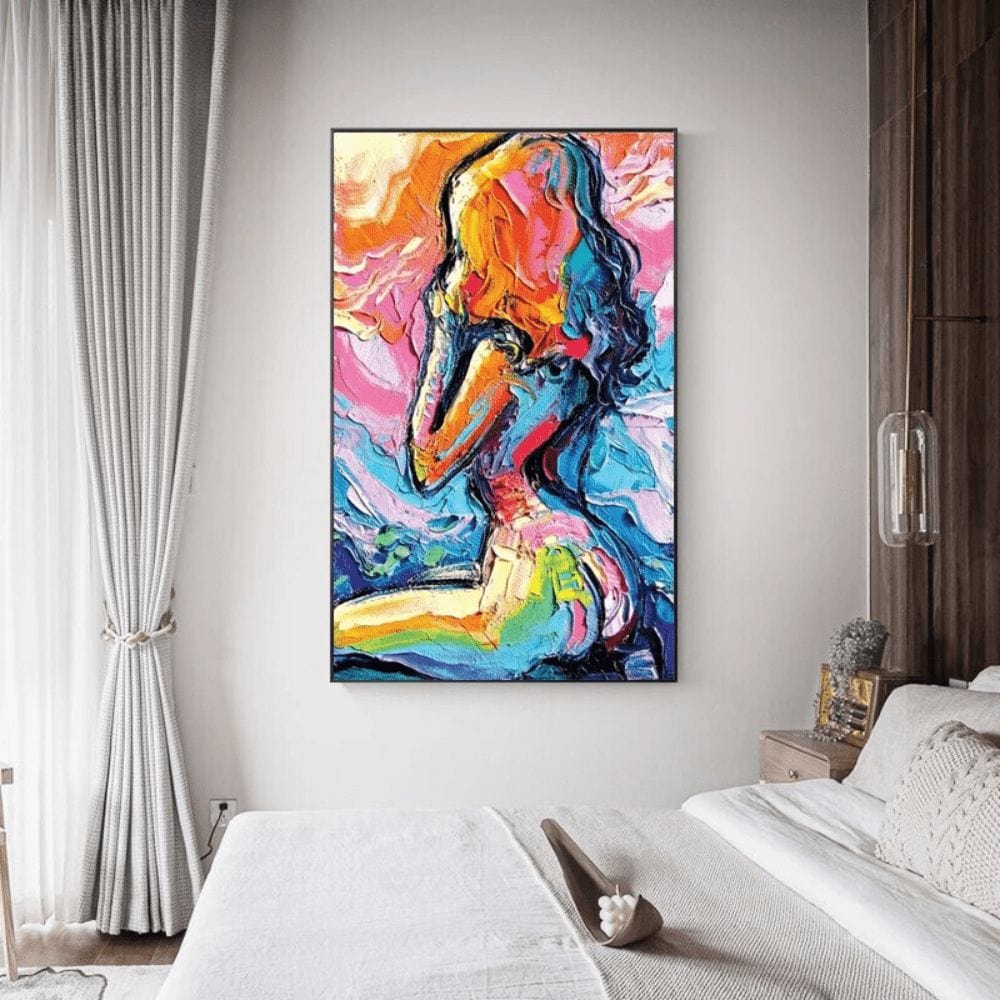 Be intrigued by "NXDE," a striking artwork featuring an orange canvas adorned with modern graffiti and abstract blue hues. This captivating piece portrays a curvy naked woman sitting on her back, her face obscured by her luscious hair. With its bold colors and evocative imagery, "NXDE" sparks curiosity and invites interpretation.