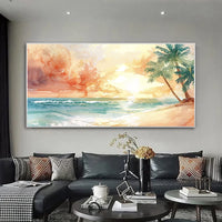 Behold the captivating warmth of "Persimmon Sunset." This painting captures a stunning beach scene as the sun sets, casting a golden glow over coconut trees and gentle waves. The artwork evokes the tranquil joy of a secluded beach, where both day and night offer their own unique pleasures.