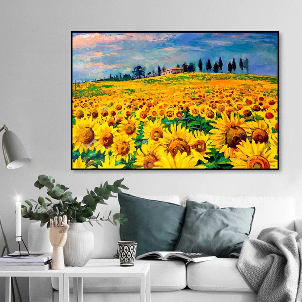 A field of sunflowers stretches across the canvas, their bright yellow faces reaching toward a soft, sunlit sky. A distant house and a few trees add to the peaceful rural setting, inviting you to bask in nature’s warm embrace.